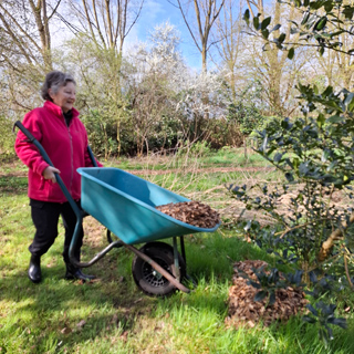 De houtsnippers die daarna nog over waren zijn rondom de stammen van de appelbomen en de hulsstruiken uitgestrooid. Dat betekent