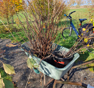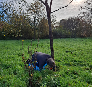 Door naar de (doorgeschoven) klusdag op zondag 12 oktober. Op deze zondagmorgen zijn er in de voedseltuin een kersenboom,