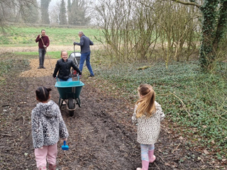 en de oudere kinderen liepen zelfs heen en weer met kruiwagens vol met houtsnippers.