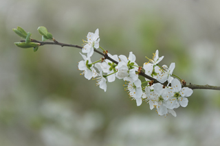 Op dit moment laten de pruimen- en de perenbomen in de voedseltuin volop hun bloesem zien. Ook staat het krentenboompje